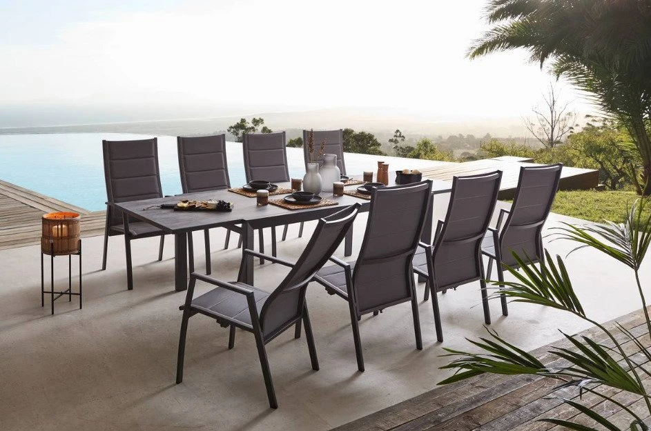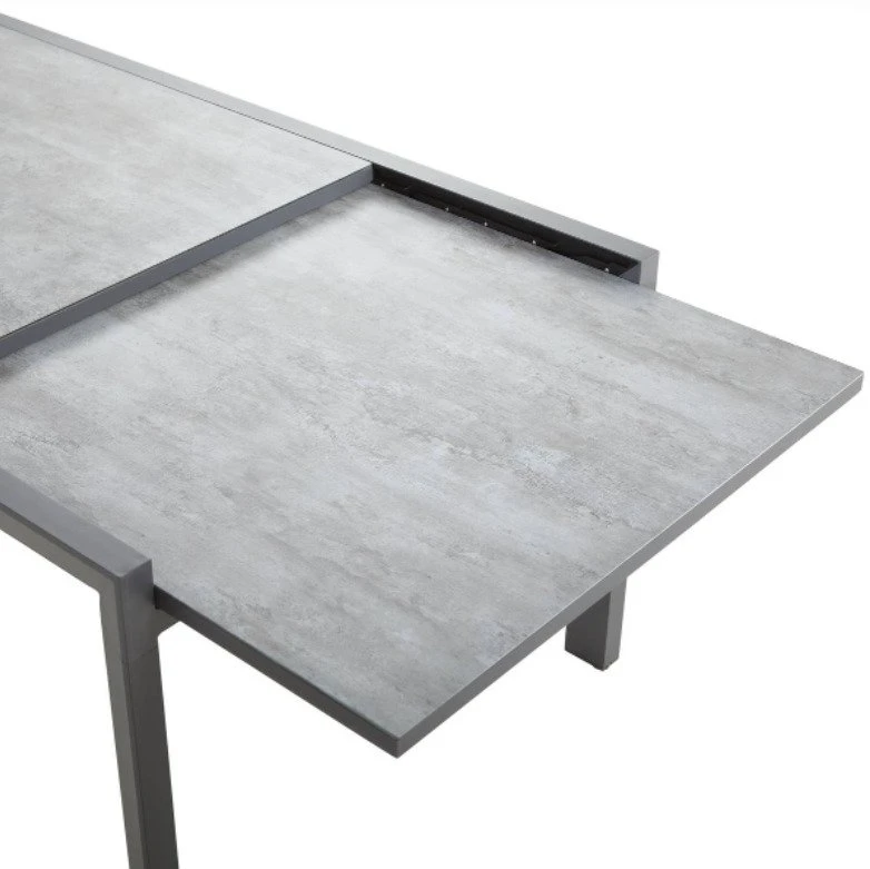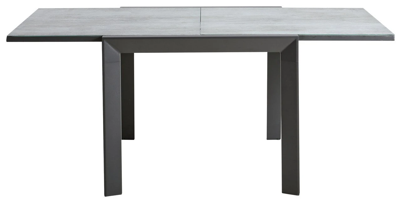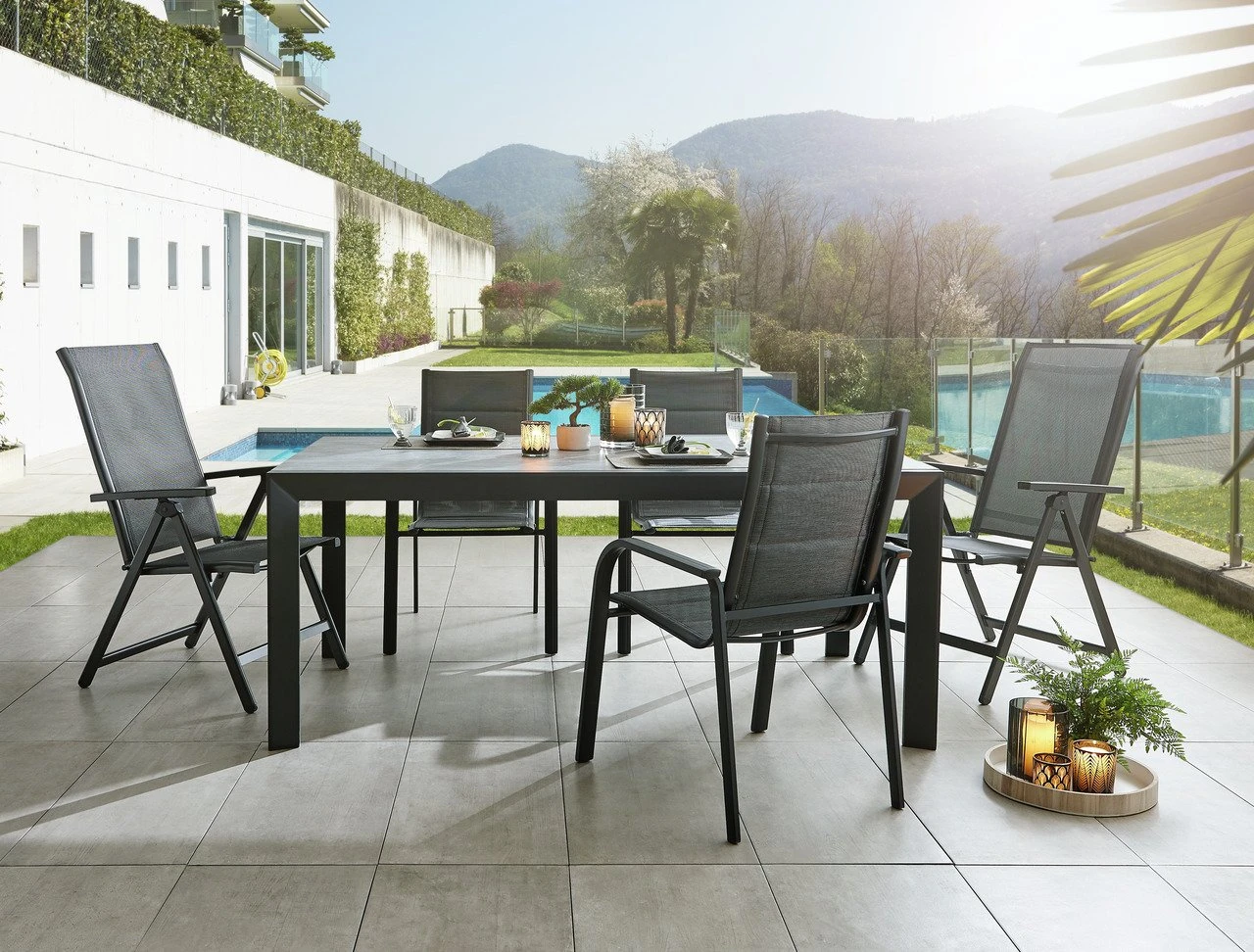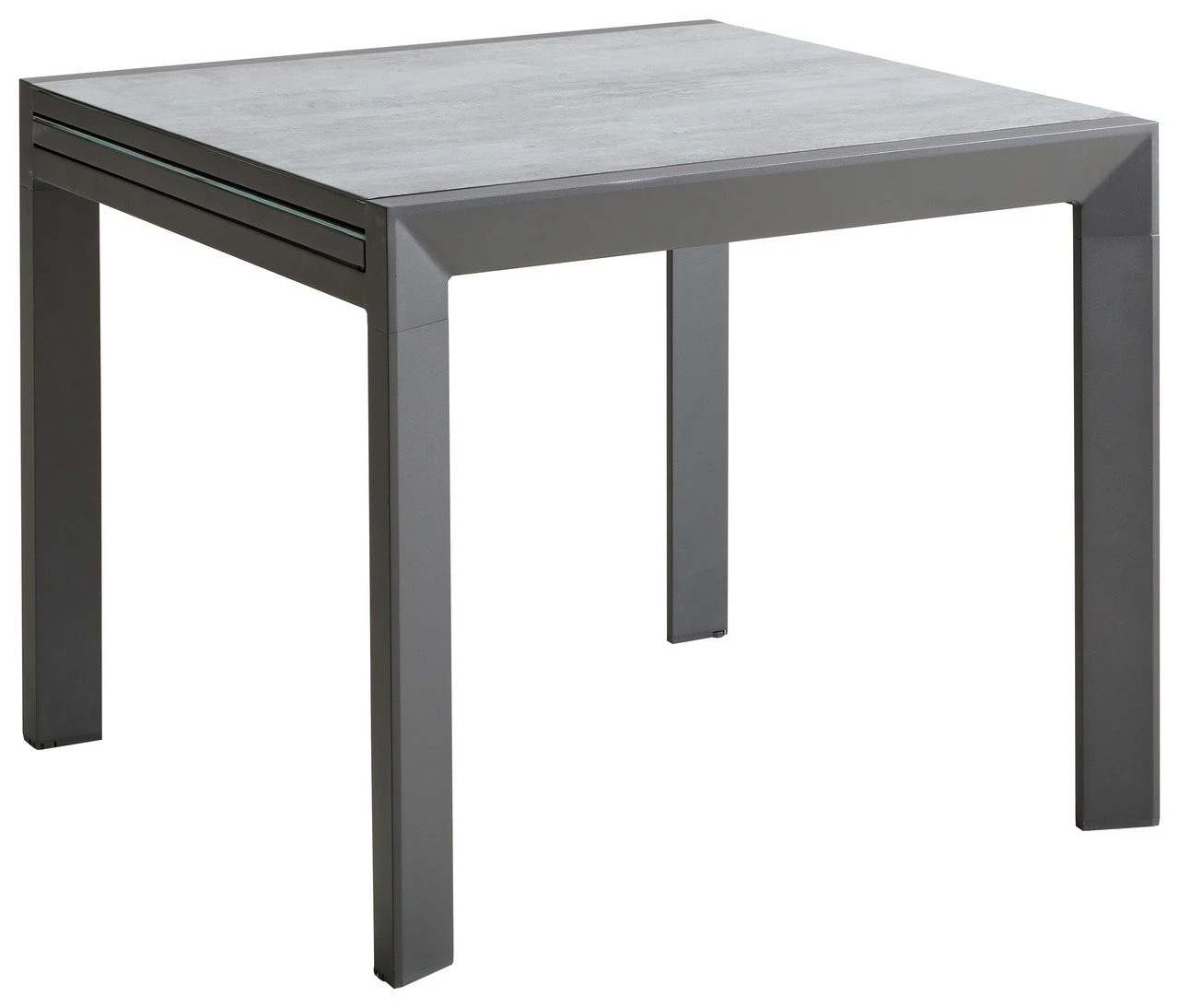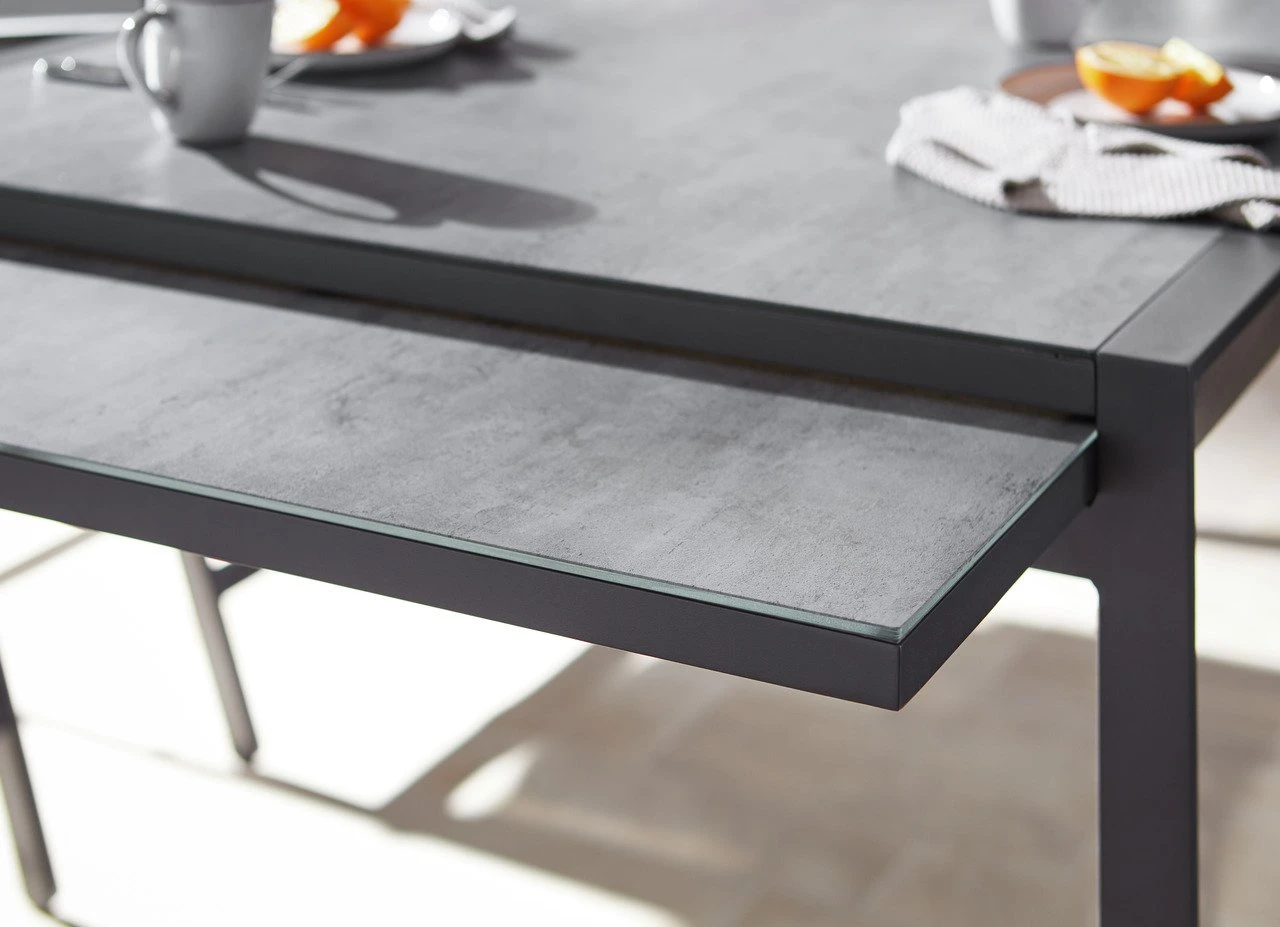 Mit dem grauen Ambia Gartentisch “TERUEL” werten Sie Ihren Außenbereich auf moderne Weise auf. Die Glasplatte in Keramikoptik und das anthrazitfarbige Gestell aus pulverbeschichtetem Aluminium bilden ein elegantes Design.