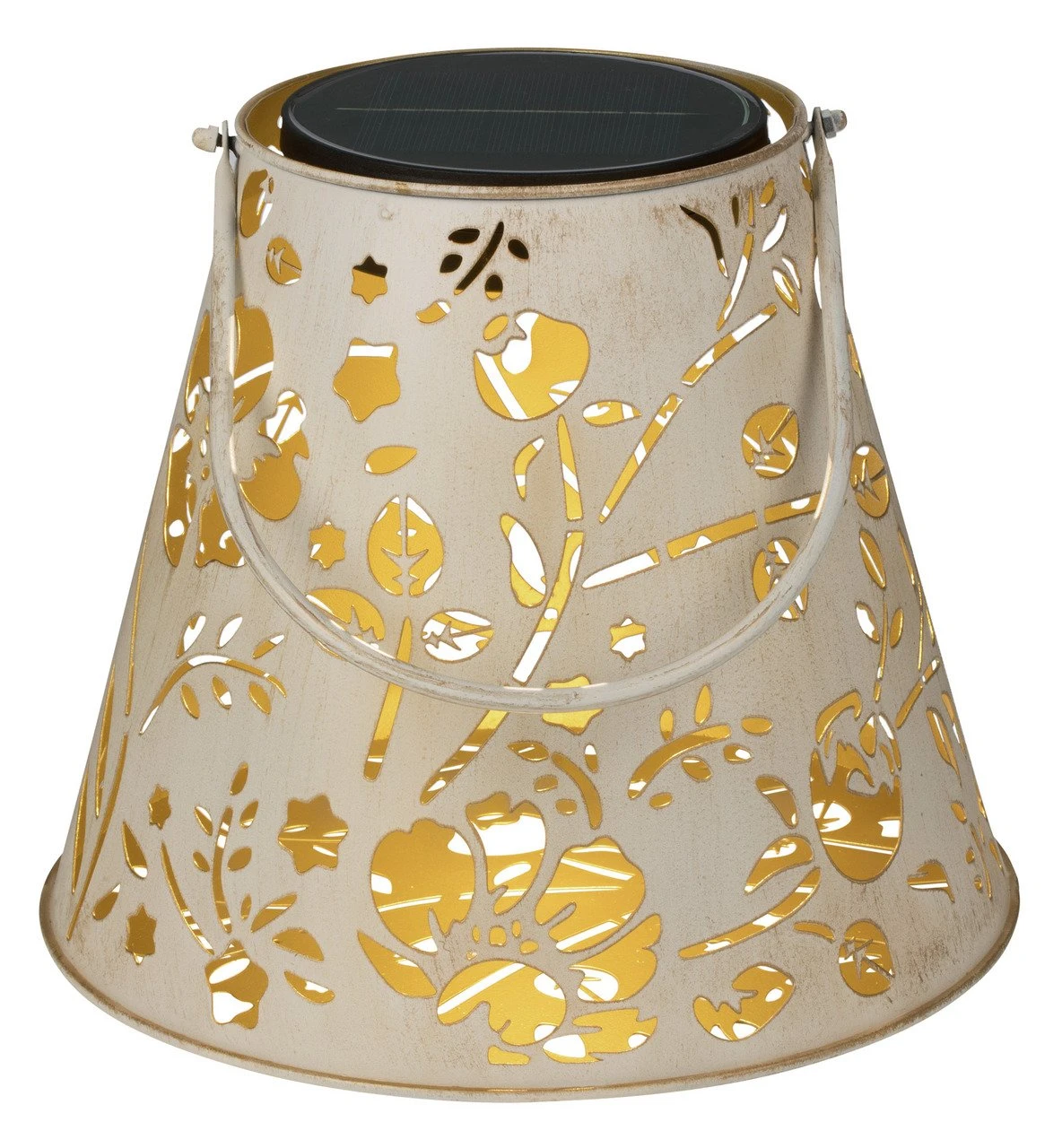 Ein ausgestanztes Blumendesign sorgt bei der LED-Solarleuchte “BERN” für bezaubernde Lichtreflexe. Die graue Metall-Leuchte (D/H ca. 27 x 22,8 cm, 0,9 kg, inklusive Batterie) ergänzt jeden Gartentisch. Ihr integriertes solarbetriebenes LED-Leuchtmittel (Schutzklasse I) spendet warmweißes Licht (4.000 K, CRI: >80).