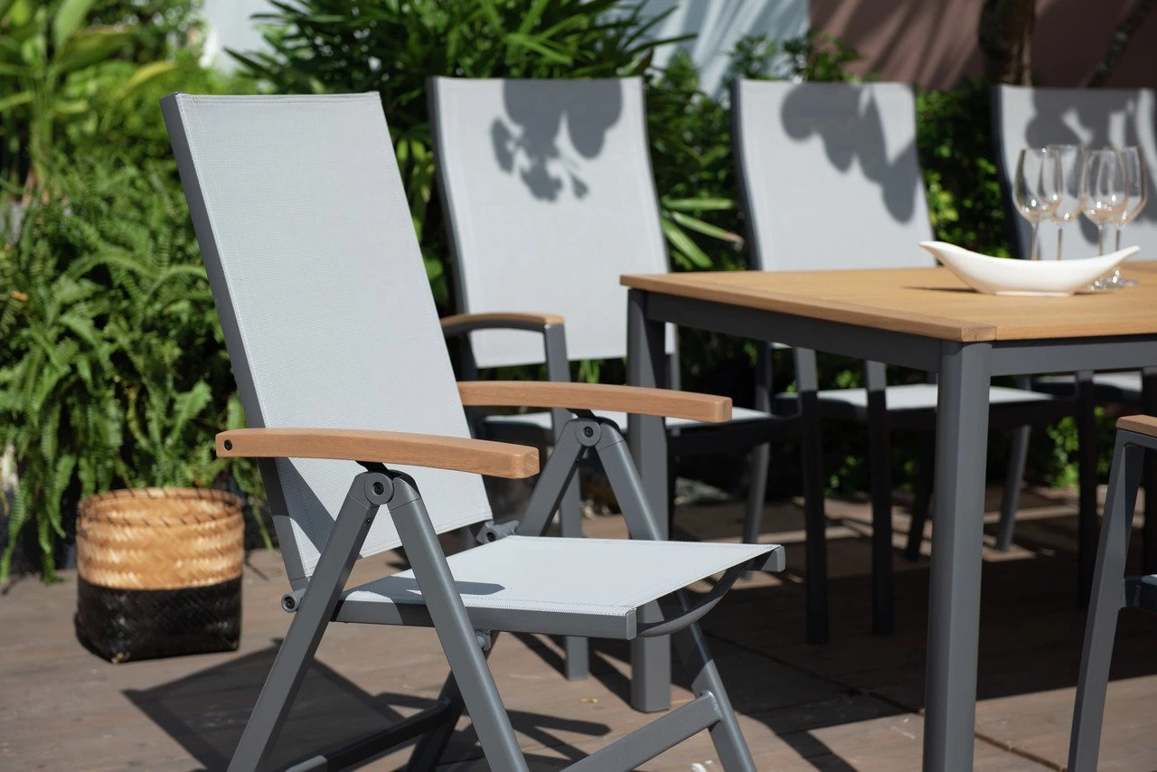 Der Multipositionssessel “BURGENLAND” von Ambia bietet Sitzvielfalt in allen Variationen. Bezogen ist er mit einem grauen Stoff, der ausgezeichnet zum lackierten Eukalyptusholz und dem Gestell in Iron Grey passt.