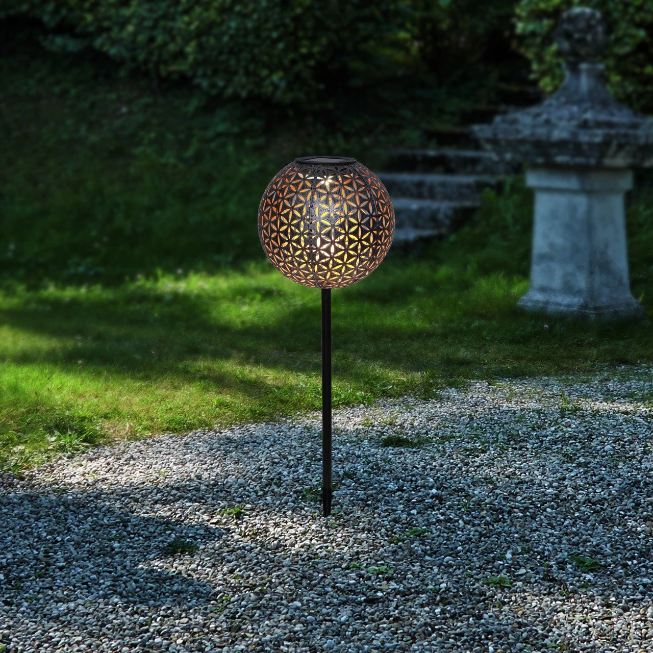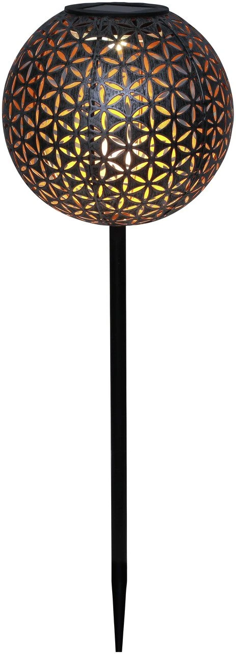 Ein hübscher Blickfang und Wegbegleiter im Outdoorbereich ist die Ambia Garden Solarleuchte “ANNA”. Sie besteht aus einem Metallstab, auf dem eine halb offene Metallkugel mit floralem Lochmuster thront (Gewicht 0,83 kg). Im Inneren der Kugel befindet sich ein sanft strahlendes Deko-Leuchtmittel (0,06 W). Durch die energiesparende Solar-Akku-Batterie (Schutzart IP44) lädt sich die Leuchte überall dort auf, wo die Sonne den Tag über intensiv scheint. Bei einem Gesamtmaß von D/H ca. 18,5 x 54 cm findet sie sogar in einem Blumenkübel ihren Platz. Nehmen Sie die Ambia Garden Solarleuchte “ANNA”!