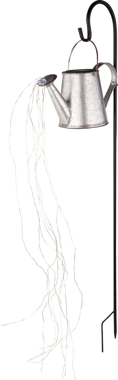Schaffen Sie einen attraktiven Bezugspunkt im Garten mit der Solarleuchte in Kannenform. Sie ist auch hochwertigem wetterfesten Metall gefertigt. Aus der an einem schwarzen Stab hängenden kleinen Gießkanne fließt eine Lichterkette mit 80 LEDs (0,06 W). Der Betrieb des sanft flackernden Deko-Leuchtmittels erfolgt über eine integrierte Solar-Akku-Batterie. Bei einem Gesamtmaß von B/H/T ca. 30 x 112 x 17 cm können Sie die bezaubernde Solarleuchte (Gewicht 3 kg) beispielsweise in einen großen Blumentopf, neben einen Pool oder in ein Beet ins Erdreich stecken. Bestellen Sie sich gleich die Solarleuchte!