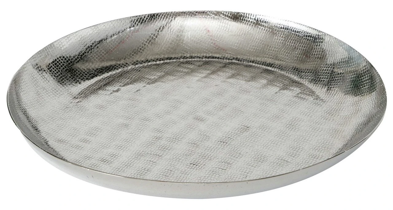 Einen einzigartigen Blickfang bildet die Boltze Schale Ø 42 cm “PASSIA”. Die silberfarbene Aluminiumschale mit gehämmerter, polierter Oberfläche bereichert Kommoden und Tische. D/H ca. 42 x 45 cm groß, 3,8 kg schwer, arrangieren Sie darin Deko, Kerzen oder getrocknete Rosen.