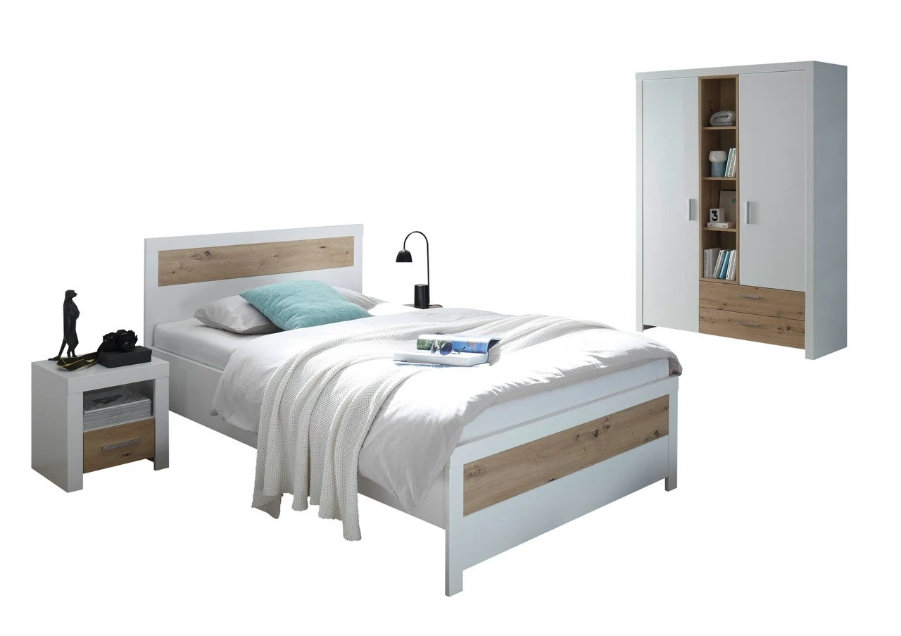 Das 3-teilige Set aus pflegeleichter Holznachbildung (Gewicht 194,9 kg) umfasst einen 2-türigen Kleiderschrank (B/H/T ca. 143 x 200 x 55 cm) mit zwei Schubkästen und vier Fächern, ein Bett mit Kopfteil (B/L ca. 120 x 200 cm) sowie einen Nachtschrank mit Schubkasten und Fach (B/H/T ca. 42 x 45 x 40 cm). Ohne Matratze und Federholzrahmen. Bestellen Sie das Boxxx Jugendzimmer “FILOU”!