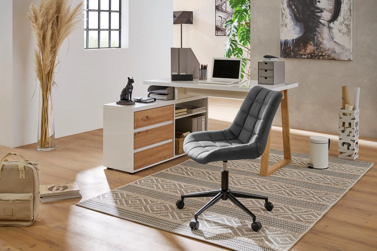Ob gemütlicher Schreibplatz im Wohnzimmer oder modernes Office, der Carryhome Drehstuhl “JIMMY” verträgt sich mit jedem Einrichtungsstil. Sein abgestepptes Polsterdesign mit grauem Stoffbezug wirkt einladend und fügt sich zusammen mit dem schwarzen Sternfuß jeder Farbatmosphäre.