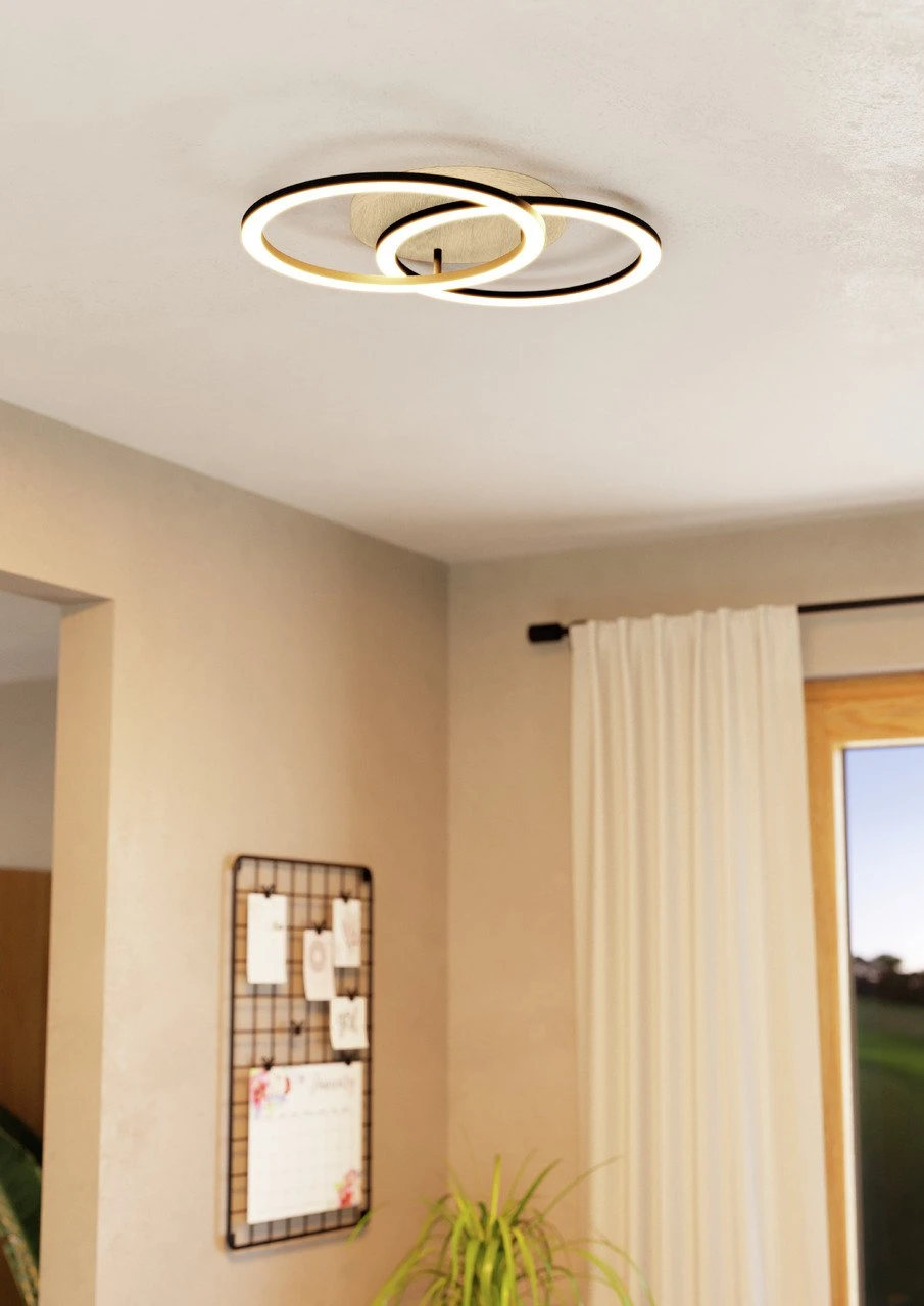 Lassen Sie mit dieser Deckenlampe Ihr Interieur erstrahlen. Die Deckenleuchte verfügt über eine Farbwechselfunktion, mit der sich die Lichtfarben Ihre Bedürfnisse anpassen lassen. Eine Möglichkeit zum Dimmen sorgt für flexible Lichtverhältnisse und eine angenehme Wohlfühlatmosphäre. Die Deckenleuchte besitzt nicht nur eine Höhe von insgesamt 35 Zentimetern, sondern auch eine Breite von 58 Zentimetern. Sie ist in Schwarz gehalten. In Eglo-Leuchten-Markenqualität begeistert die Leuchte mit einem tollen Wohnerlebnis und gelungener Gestaltung. Die Leuchte aus Stahl verfügt über eine Fünf-Jahres-Herstellergarantie. Sie bietet nicht nur ein attraktives Lichtbild, sondern avanciert dank ihrer ansprechenden Optik auch zu einem dekorativen Element.