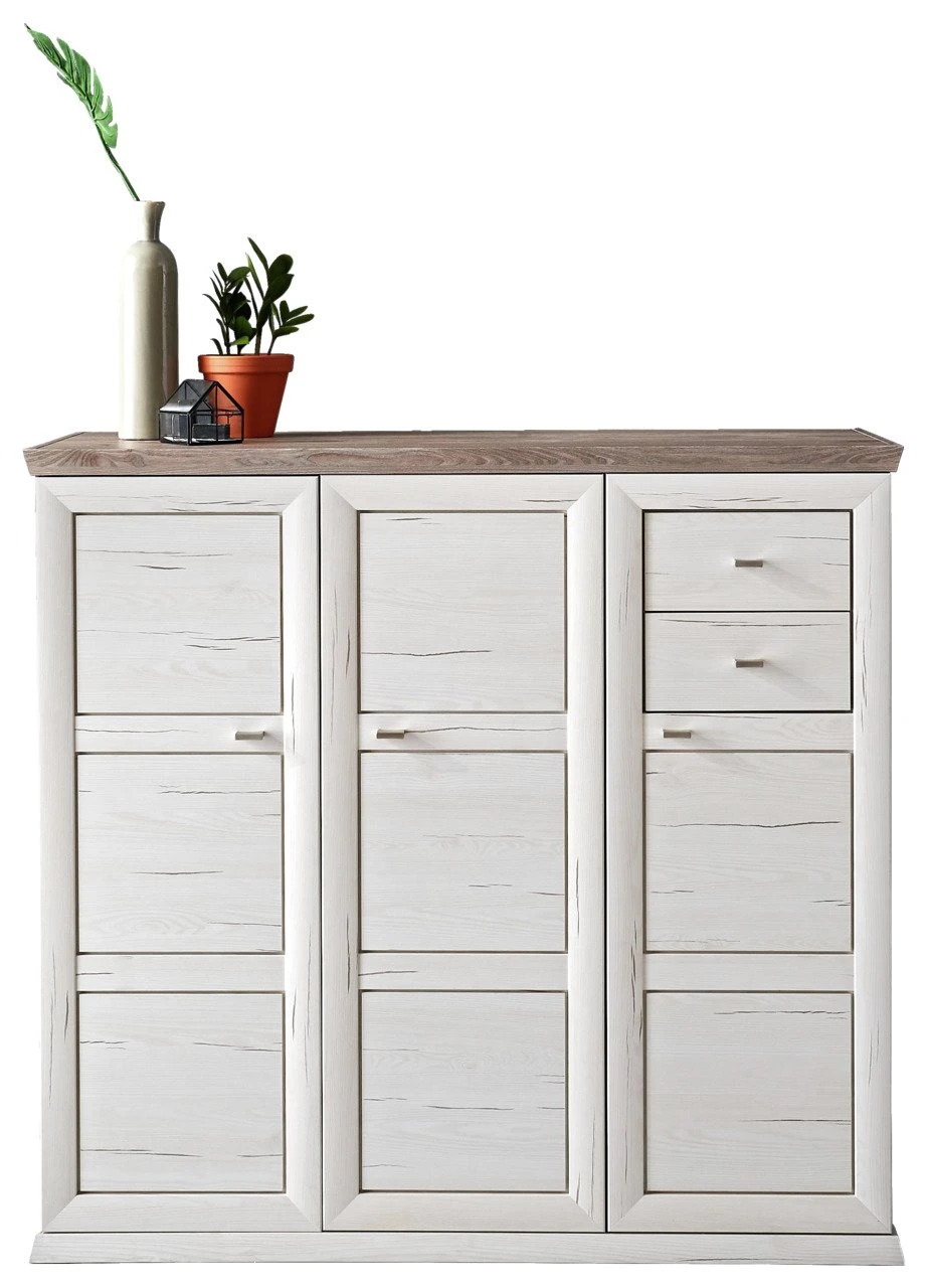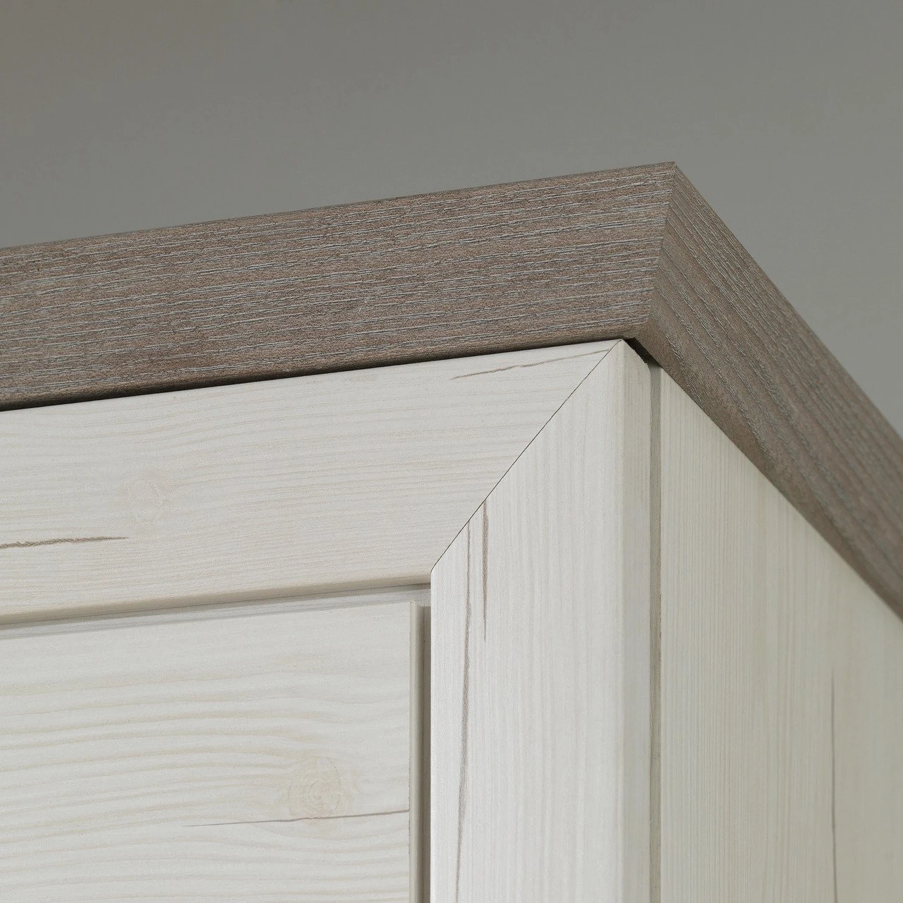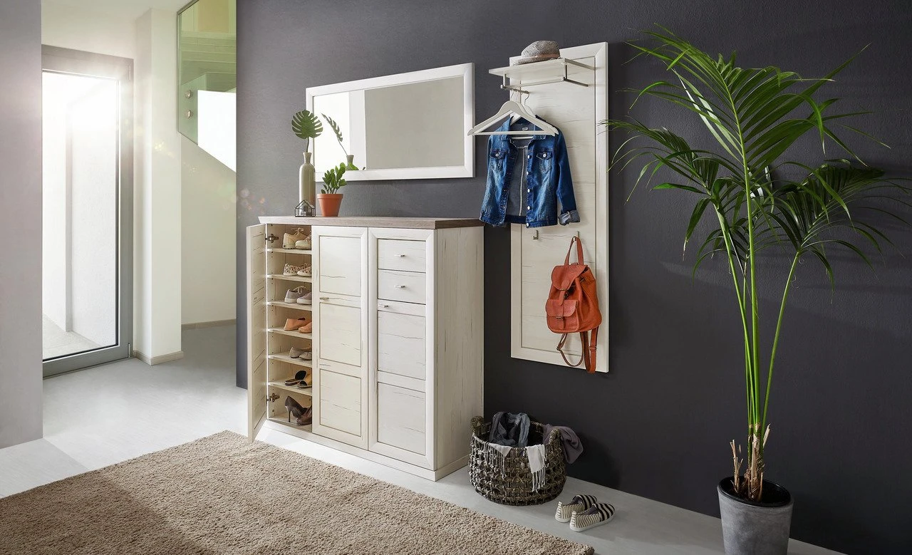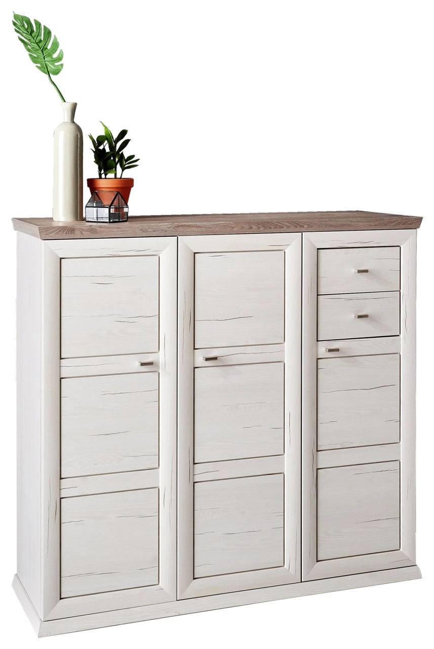Der weiße Schuhschrank “CAMRON” von Hom´in bietet reichlich Platz. Front und Korpus in edlem Pine-Aurelio-Design werden mit einer Deckplatte in Gray kombiniert. Die Griffe sind nickelfarbig.
