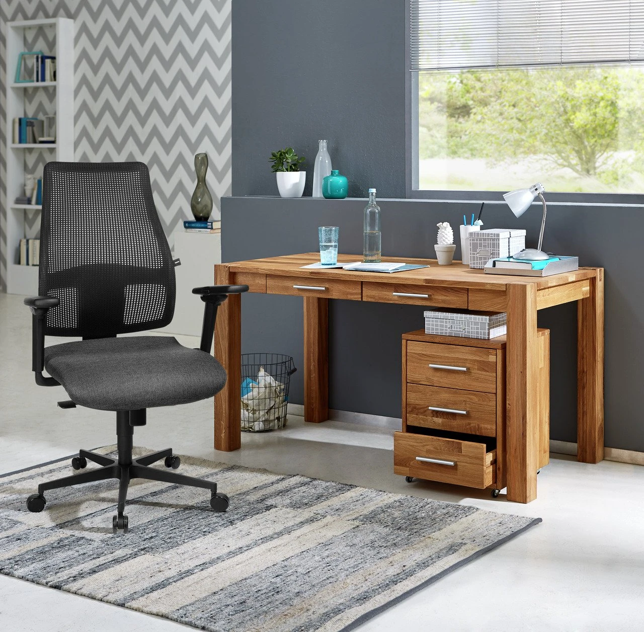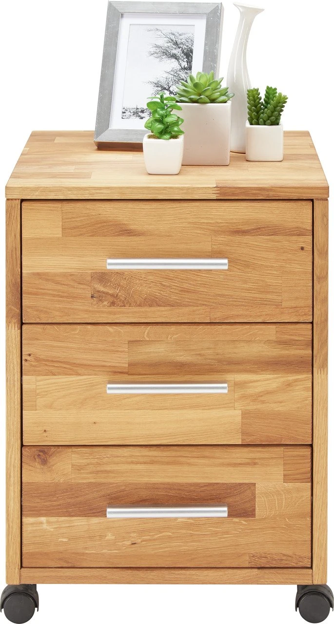 Mit den Maßen B/H/T ca. 40 x 55 x 42 cm präsentiert sich der Rollcontainer als kompakter Allrounder. Er bringt mit seinen drei Schubladen viel Stauraum in das Home Office oder das Zuhause und lässt sich dank der Rollen problemlos bewegen. Gefertigt ist er aus massiver Wildeiche, somit behauptet er sich als besonders robust. Bestellen Sie sich den praktischen Rollcontainer “OKAY” von Linea Natura.