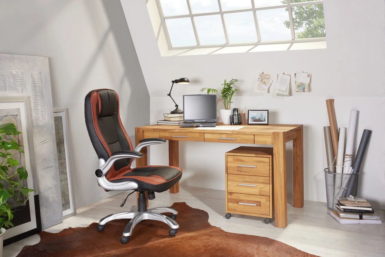 So macht Büroarbeit gleich viel mehr Spaß: Der Schreibtisch “Okay” von Linea Natura begeistert durch seine wunderschöne Optik im modernen Landhausstil. Der gesamte Tisch ist aus massiver Wildeiche gefertigt. Besonders reizvoll ist die keilverzinkte Tischplatte, da diese den Holzcharakter wunderschön unterstreicht. Die Griffe in Aluoptik setzen einen gekonnten Designakzent. Der Tisch passt perfekt in ein modernes Wohnambiente.