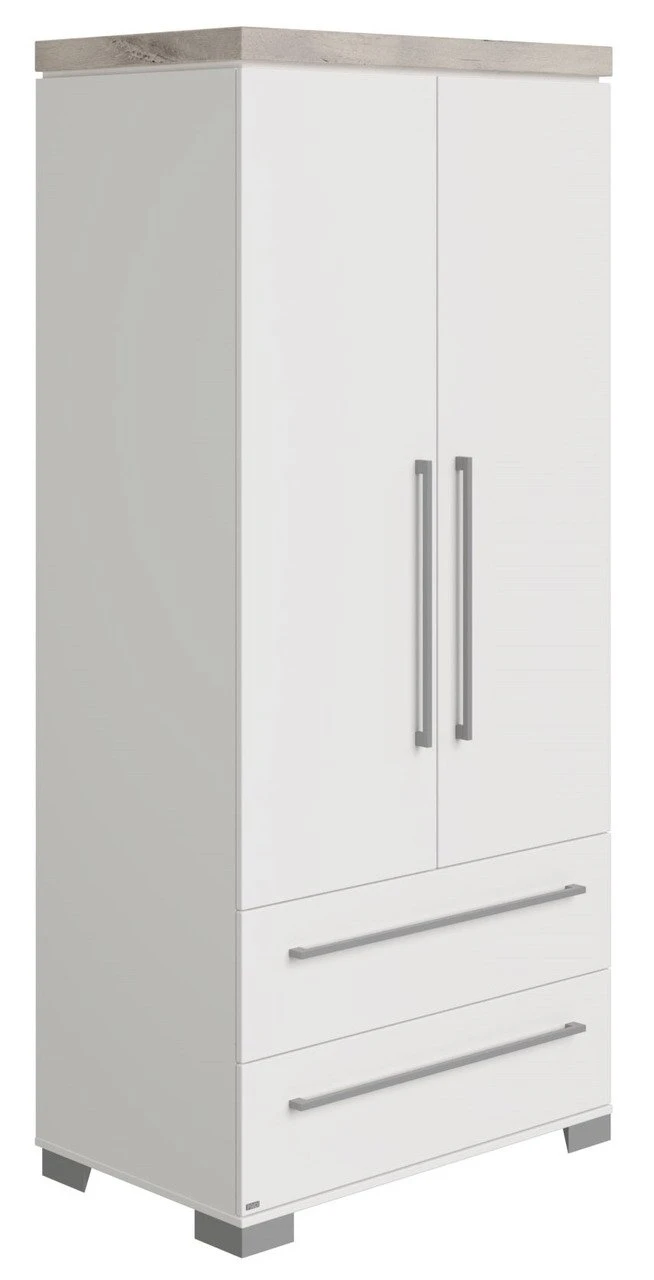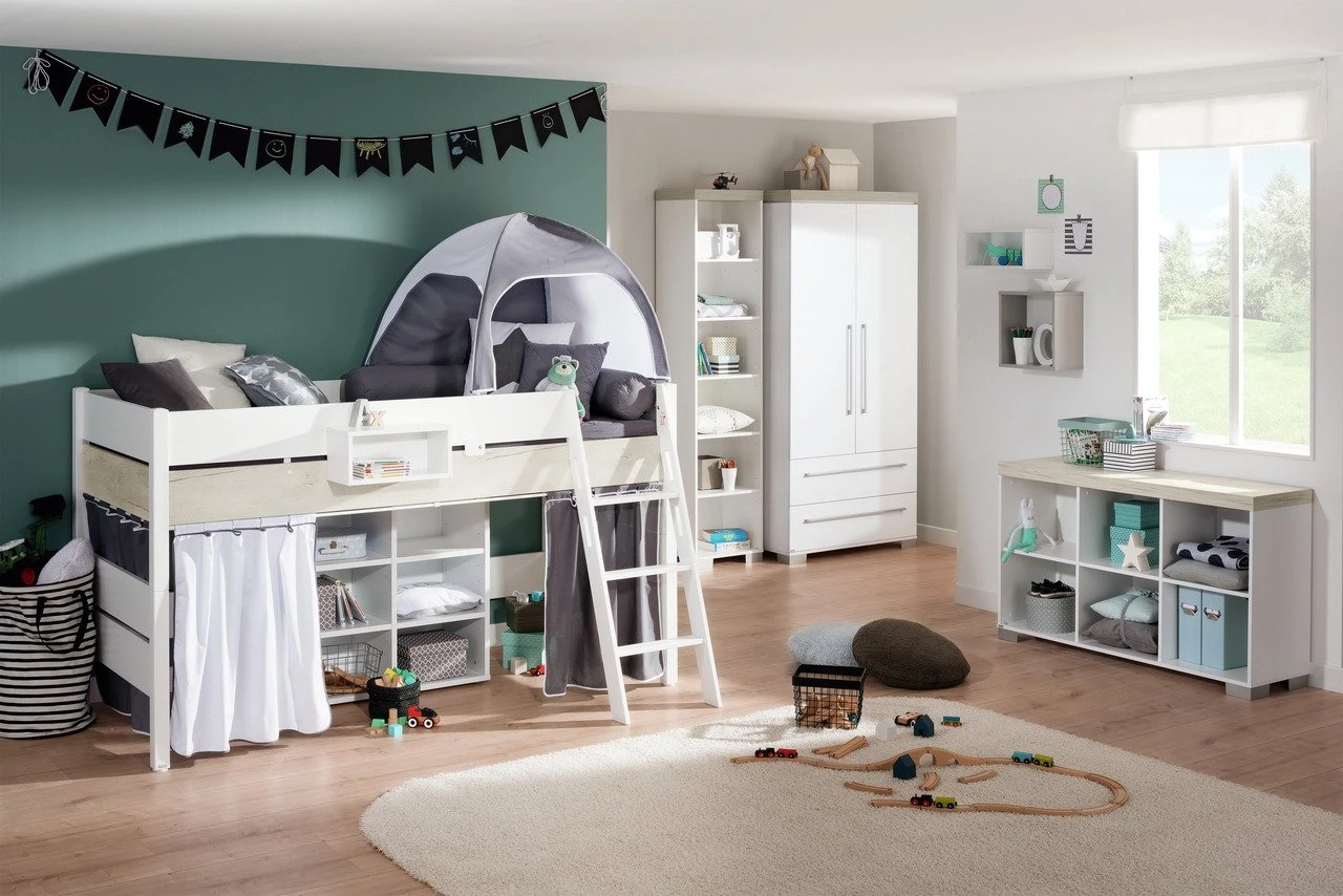 Für das helle Jugendzimmer mit freundlichem Charakter ist der kreideweise Paidi Kleiderschrank “KIRA” der perfekte Stilpartner. Dezente Farbkontraste setzen alufarbige Kunststofffüße (rechteckig) und eine Oberplatte im Dekor Eiche-Nautik.