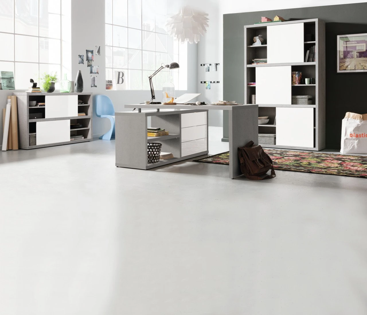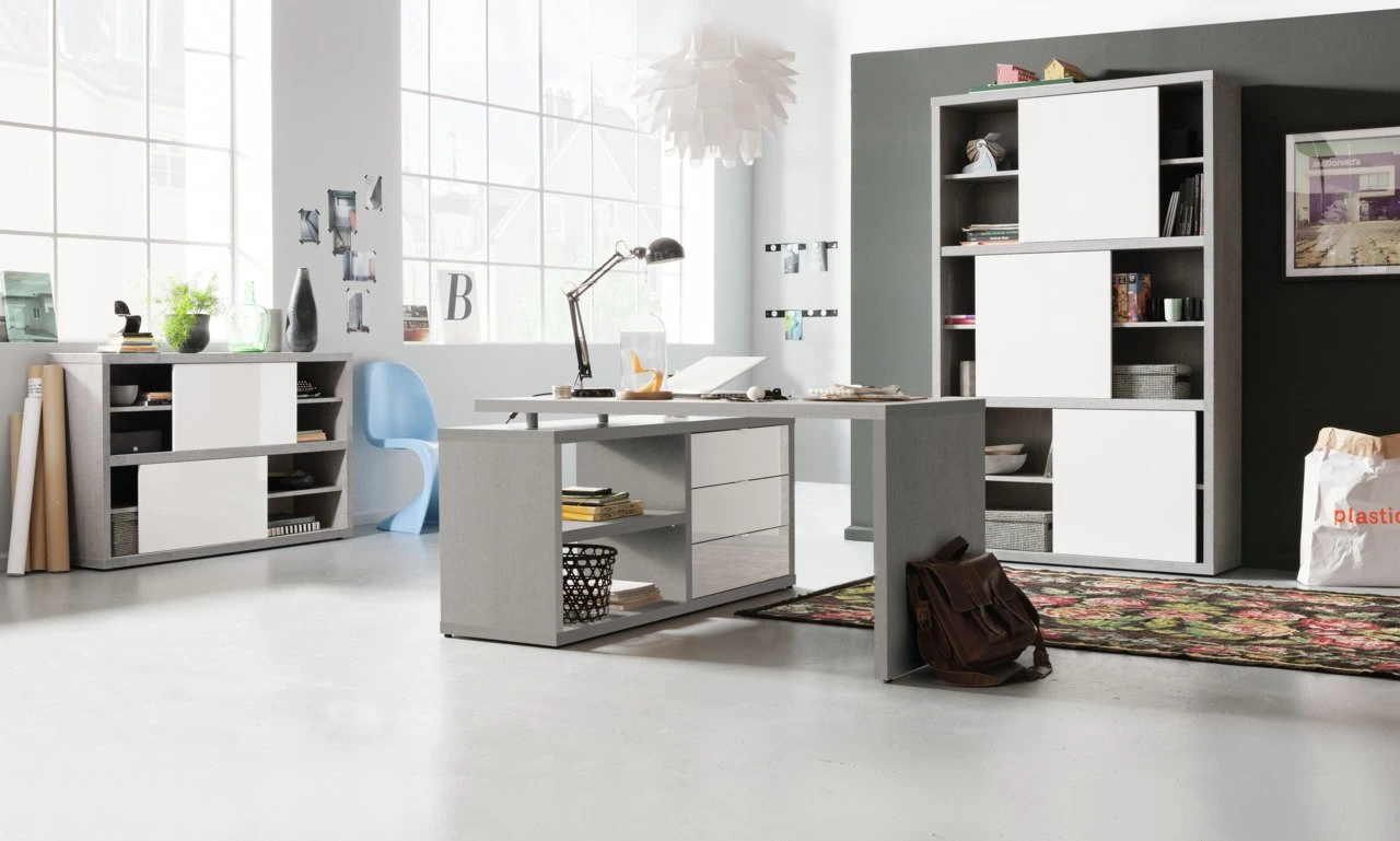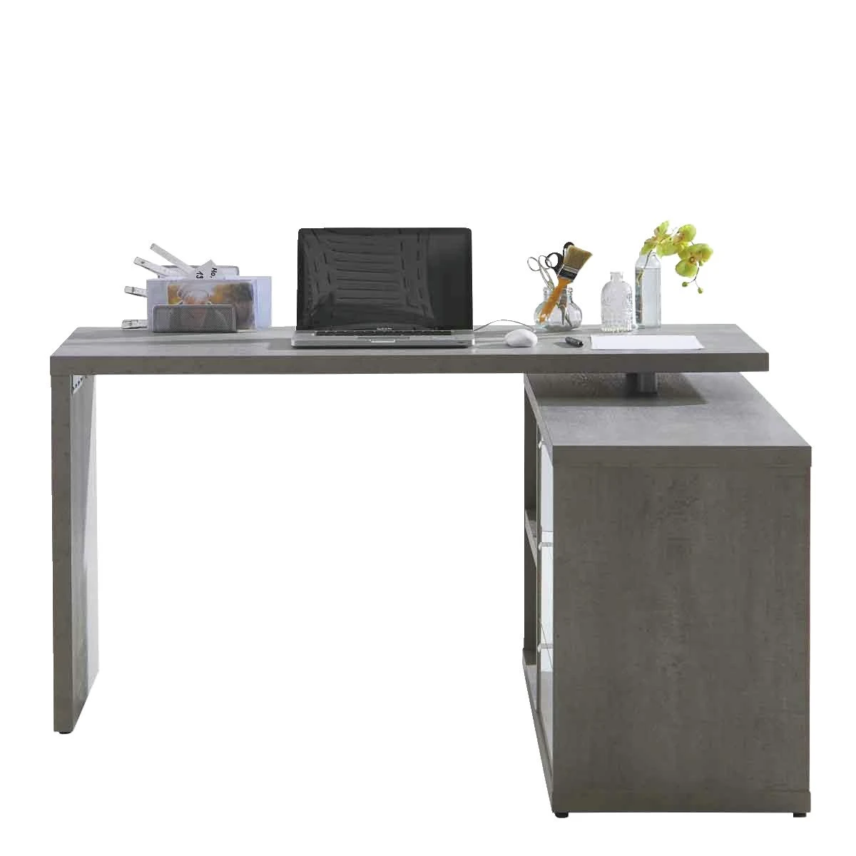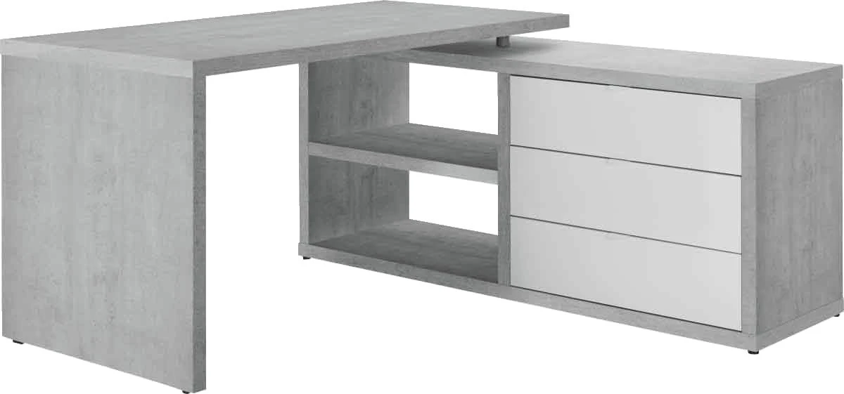 Im modernen Design und mit gekonnter Aufteilung präsentiert sich der komfortable Eckschreibtisch “PUNTO” der Marke XORA. Er lenkt die Blicke mit seiner vorteilhaften und trendigen Betonoptik in sehenswerter Holznachbildung auf sich. Ansprechend sind auch die Hochglanzfronten der Schubfächer und die speziell abgesetzte Halterung zwischen Schreibtischplatte und fest integriertem Container.