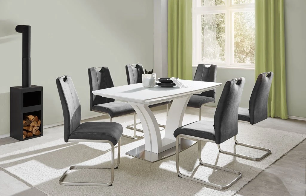 Mit einem Gestell aus gebürstetem Edelstahl und einem Stoffbezug ist der Freischwinger-Stuhl “TEXAS” von XORA nicht nur ein optisches Highlight, denn zusammen mit einer Belastbarkeit von bis zu 120 Kilo sorgen die großzügige Maße von B/H/T 44 x 98 x 59 cm für bequemen Sitzkomfort. Sitzen Sie bequem beim Essen oder bei der Arbeit!