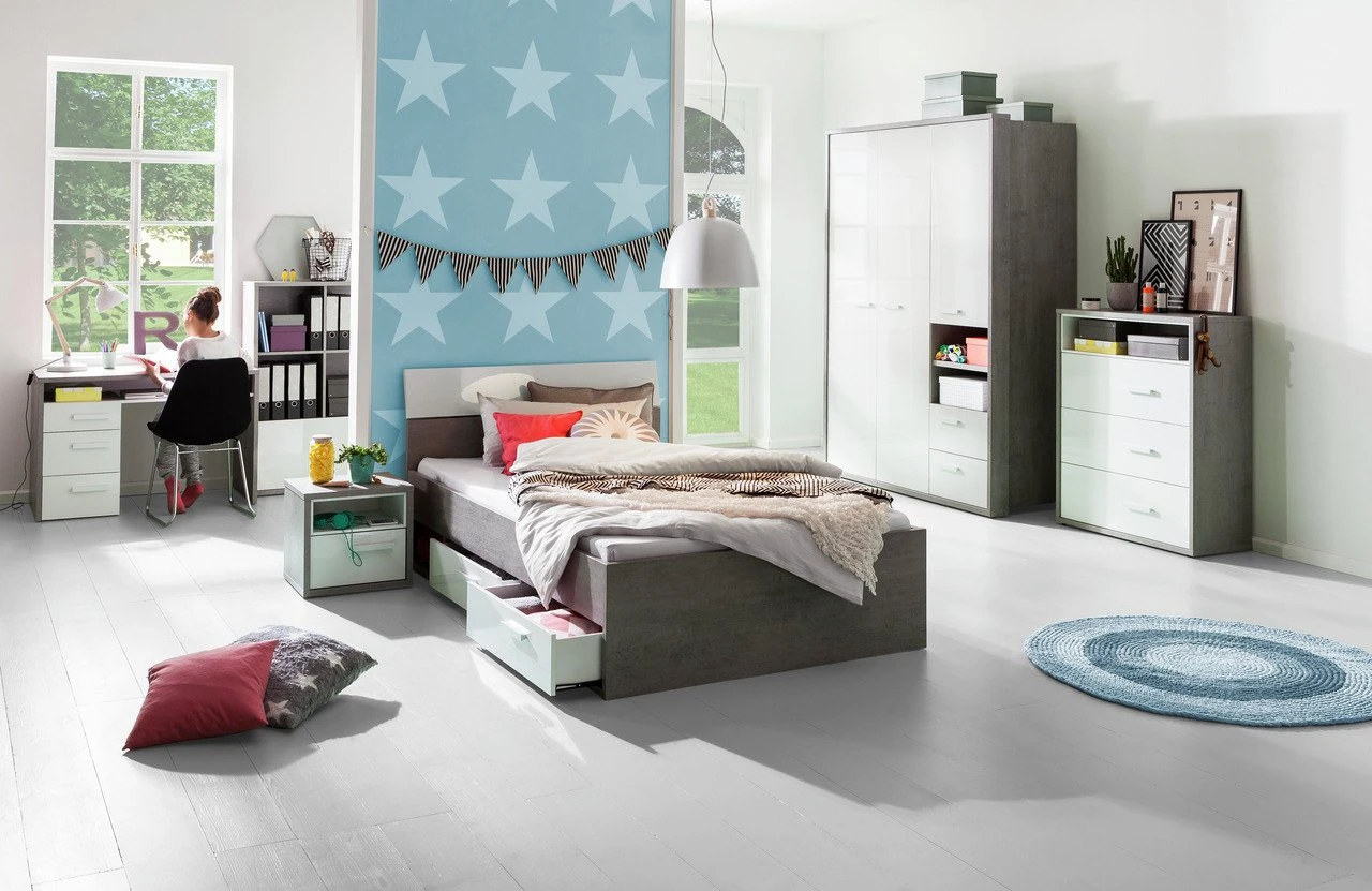 Das Stauraumbett “MIPIACE” von Xora zeigt sich in einem zeitgemäßen Design, das aus der betonfarbenen Holznachbildung resultiert und sich dadurch harmonisch in Ihr Schlafzimmer einfügt. Es besteht aus einem Kopf- und Fußteil sowie einer Schubladenfront.