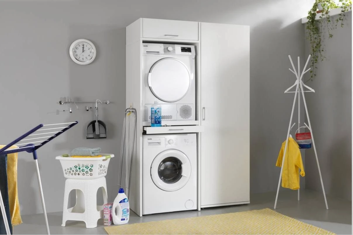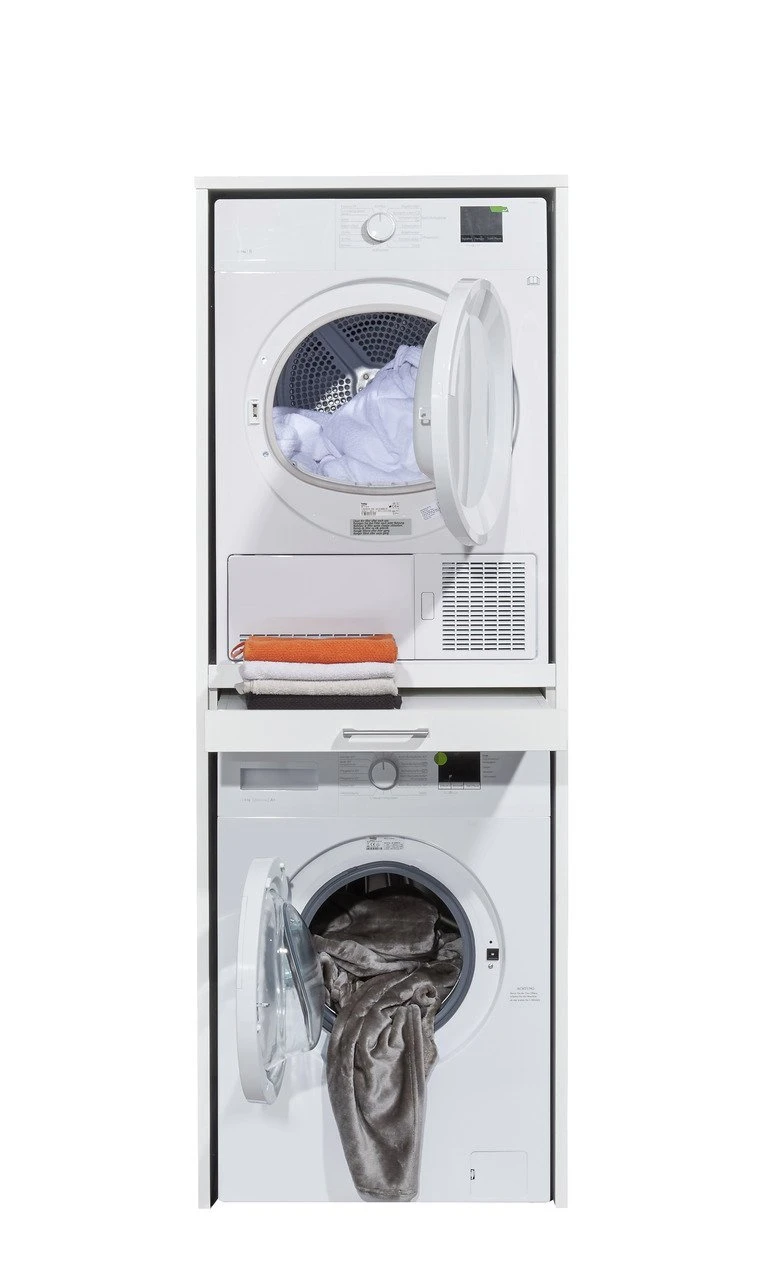 Der Xora Geräteschrank Typ WSTT185 “WASCHMAX” harmoniert zu jedem Wohnkonzept und ist die Lösung für enge Räume. In dem geradlinigen weißen Modell können Sie zwei Geräte bequem unterbringen.