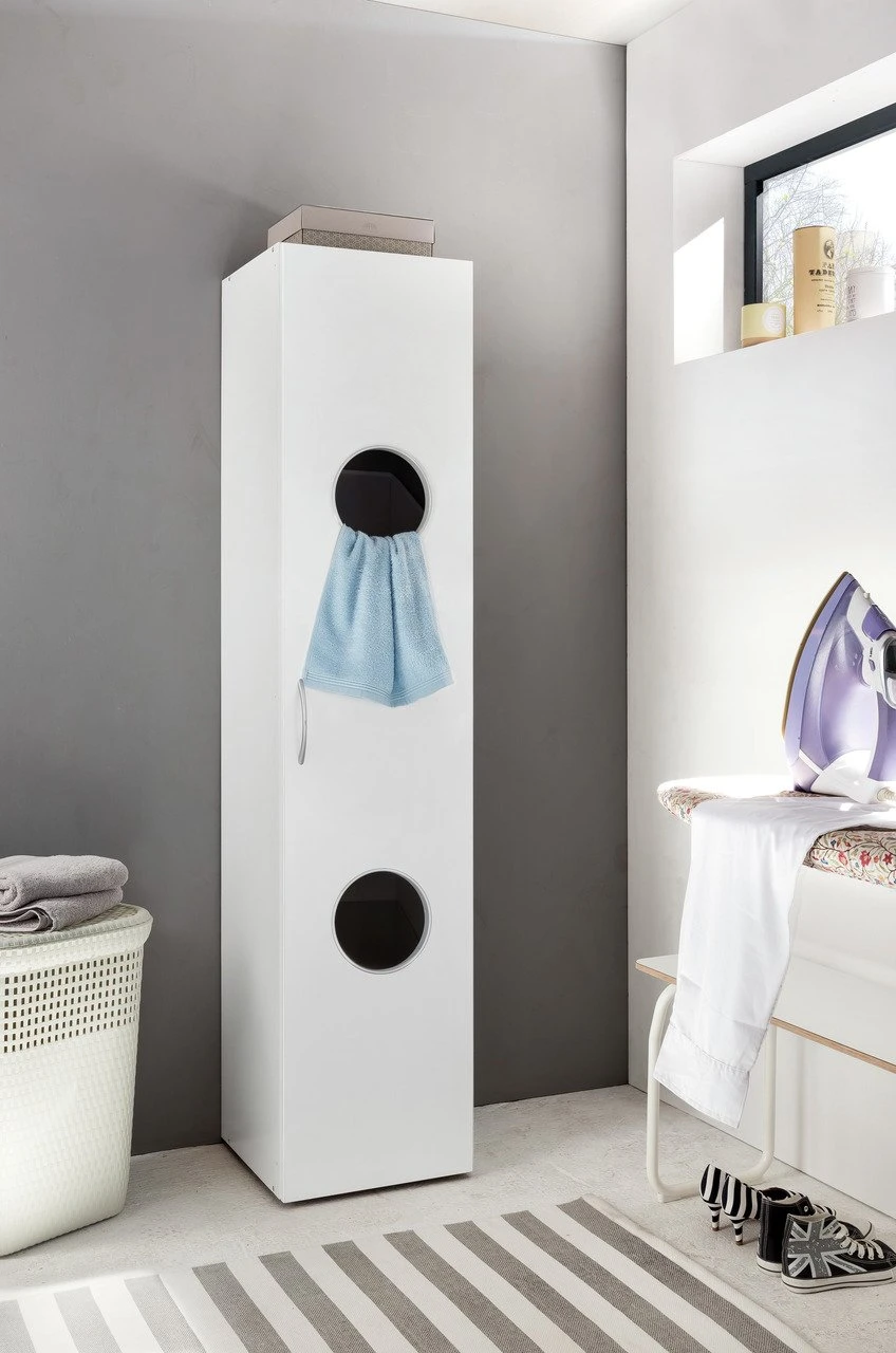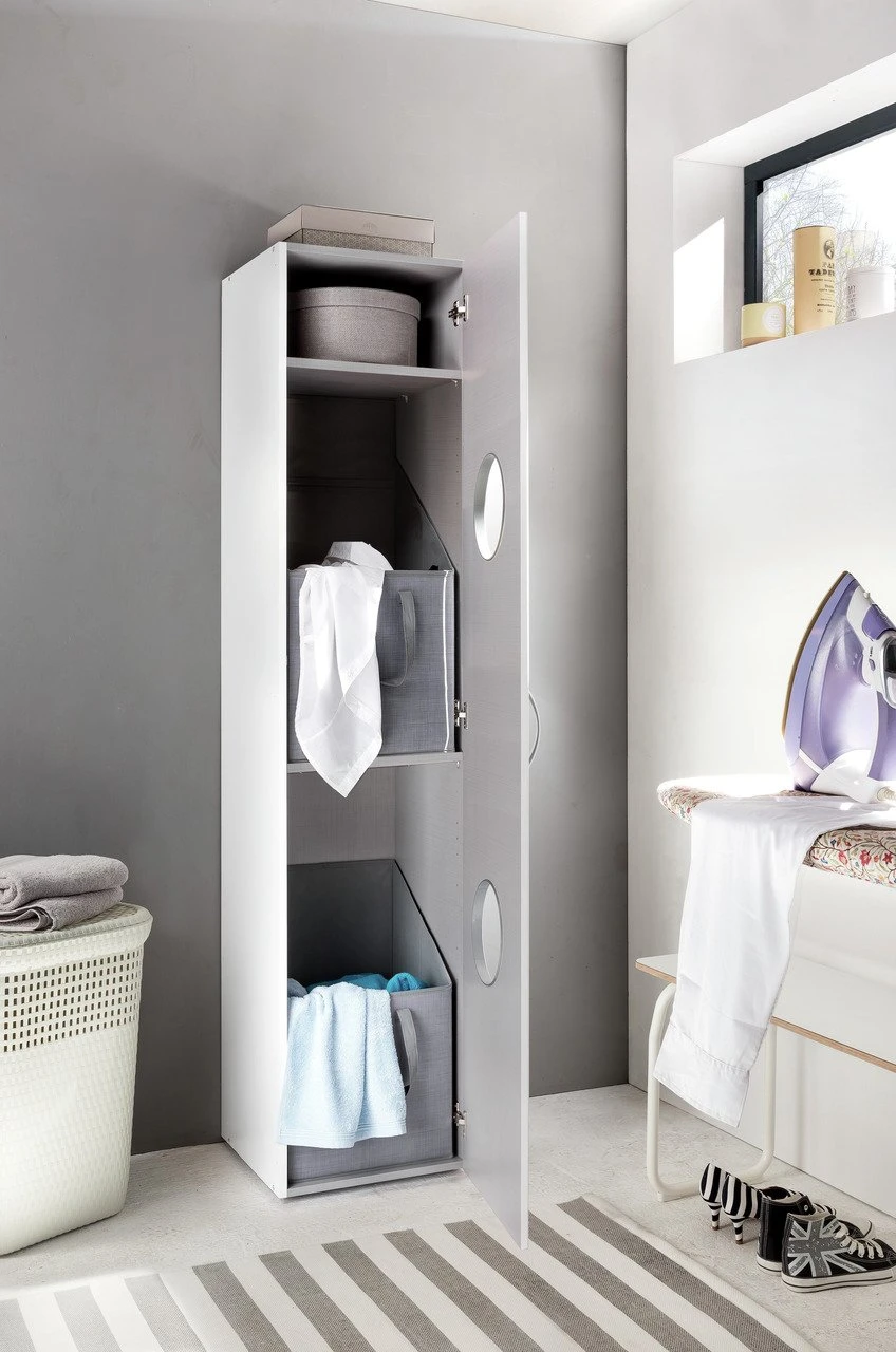 Schmutzwäsche trendig aufbewahren? Das ist mit dem Xora Wäscheschrank “MULTIRAUMKONZEPT” möglich. Der B/H/T ca. 40 x 185 x 40 cm große Schrank passt mit seiner schmalen Gestaltung in noch so kleine Räume. Korpus und Front ergänzen mit zeitlosem Weiß jeden Einrichtungsgeschmack. Hinter der Drehtür mit Kunststoffgriff unterteilen zwei Fachböden den großzügigen Stauraum. Dort sortieren Sie in zwei inkludierten Wäschekörben Bunt- oder Kochwäsche. Dank solider Holznachbildung begleitet Sie das clevere Möbel viele Jahre. Mit 34 kg steht es stabil. Stellen Sie den Xora Wäscheschrank “MULTIRAUMKONZEPT” in Ihre Badezimmer oder in den Waschraum!