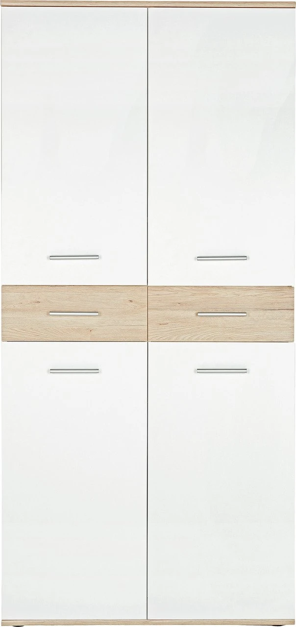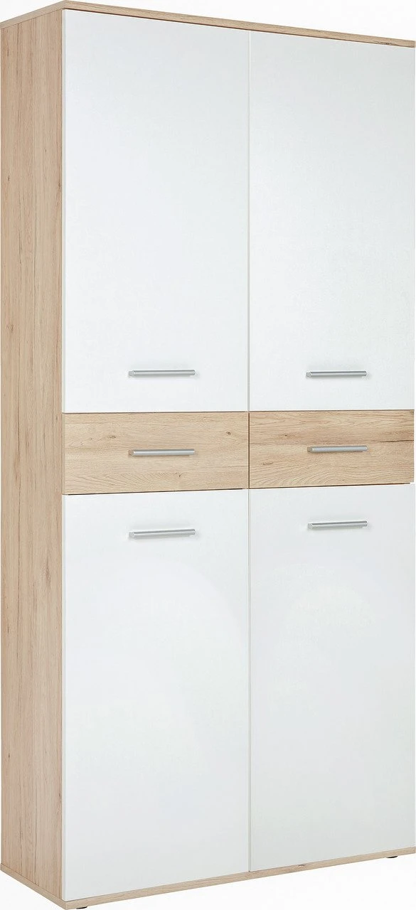 Den Xora XL-Schuhschrank “FAKIR” können Sie als Ordnungshilfe unkompliziert in den modernen Skandilook im Eingangsbereich integrieren. Sein gerader Korpus und die beiden Schübe im hellen San-Remo-Eiche-Dekor werden von weißen Türfronten und mattsilbernen Bügelgriffen elegant begleitet.