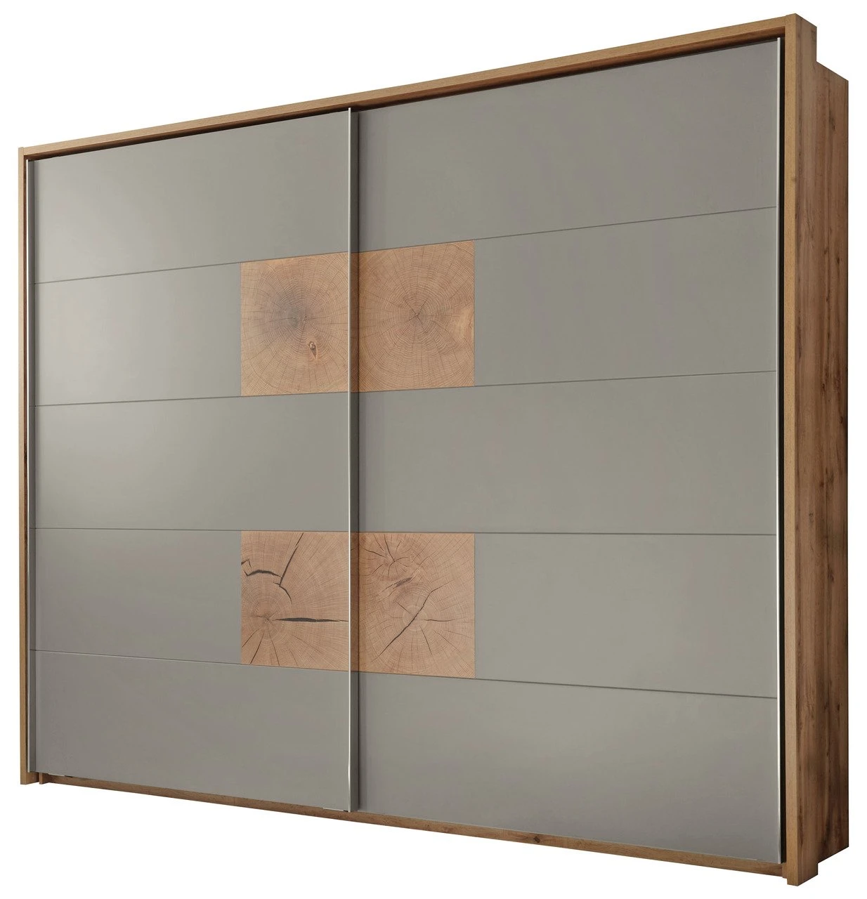 Der Z2 Schwebetürenschrank 2-türig “CAPRI” macht das gleichnamige Herstellerprogramm für ein modernes landhausbezogenes Schlafzimmer komplett. Sein geradliniger Korpus im heimeligen Wildeiche-Dekor erhält durch die basaltgrauen Fronten sowie die beiden mittig platzierten Hirnholz-Absetzungen ein elegantes Finish.